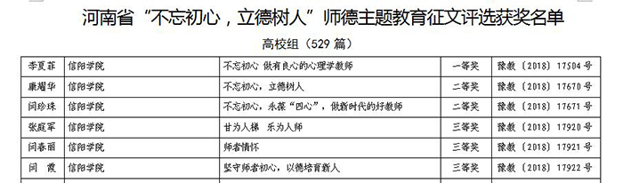 日前,河南省教育厅下发了《关于公布“不忘初心 立德树人”师德主题教育征文演讲比赛和优秀案例评选结果的通知(教师〔2018〕793号)》,我校6名青年教师获奖。