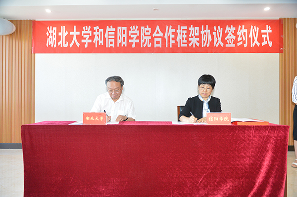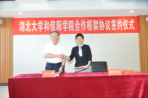 在热烈的气氛下,谢红星与高云共同签署了湖北大学与信阳学院合作框架协议,并互赠纪念品、合影留念。