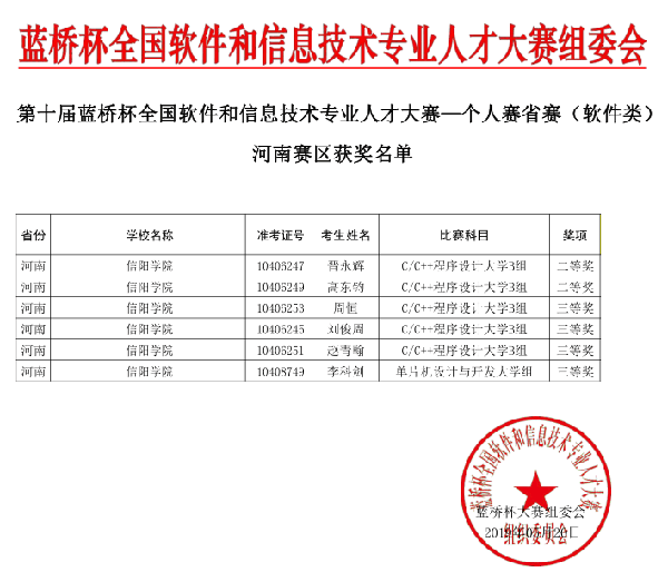 3月24日,在黄淮学院举行的第十届蓝桥杯全国软件和信息技术专业人才大赛河南赛区比赛中,由我校数学与信息学院的骆魁永、金广坤2位教师指导的学生在比赛中获得二等奖2项、三等奖4项。其中晋永辉、高东钧同学获得C/C++程序设计大学B组河南省赛区二等奖;周恒、刘俊周、赵青翰同学获得C/C++程序设计大学B组河南省赛区三等奖;李科剑同学获得单片机设计与开发B组河南赛区三等奖。