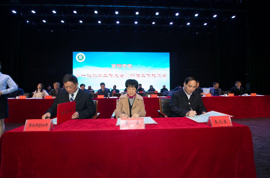 随后,在庄严的气氛中,举行了《本科教学工作合格评估与建设责任书》签订仪式。高云、王北生与各位校领导签订责任书;有关分管校领导与部分职能部门负责人签订责任书;各位联系基层校领导与各学院院长签订责任书。