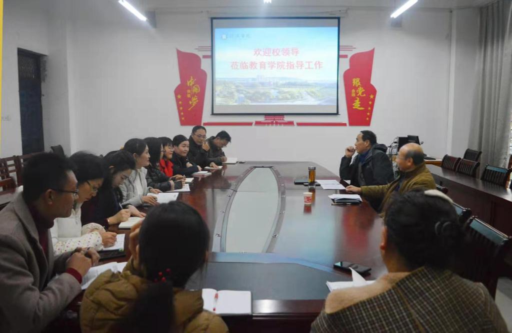 王北生认真听取了汇报。他高度重视高级职称人员引进和青年教师培养工作,对教育学院青年教师科研情况、现有高级职称人员情况和高层次人才引进情况进行一一了解。他指出,本科教学工作合格评估是学校当前和今后几年的中心工作,全体教师要以评估为契机,深刻领会新时代高等教育面临的新使命新要求;要坚持问题导向,深刻分析学院现存的短板和不足;要精准发力,注重外引与内培相结合,逐个落实,一一跟进,定下任务,明确完成时间表。