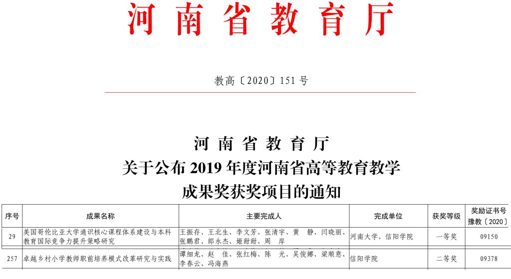 近日,河南省教育厅下发了《关于公布2019年度河南省高等教育教学成果奖获奖项目的通知》(教高〔2020〕151号),我校2项教学成果荣获河南省高等教育教学成果奖。其中,我校联合河南大学申报完成的《美国哥伦比亚大学通识核心课程体系建设与本科教育国际竞争力提升策略研究》项目荣获一等奖;教育学院申报的《卓越乡村小学教师职前培养模式改革研究与实践》项目荣获二等奖。
