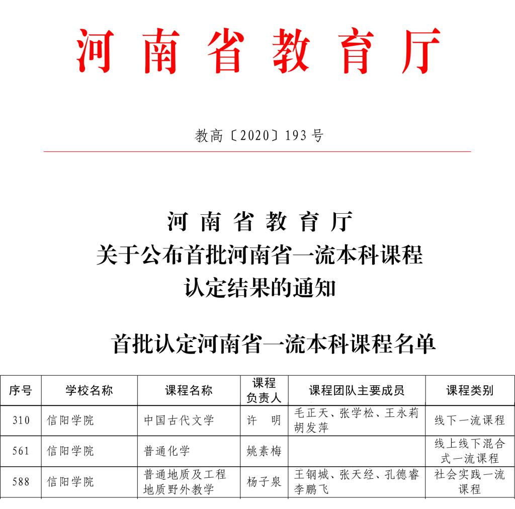 近日,河南省教育厅下发了《关于公布首批河南省一流本科课程认定结果的通知》(教高〔2020〕193号),我校申报的《中国古代文学》《普通化学》《普通地质及工程地质野外教学》三门课程分别被认定为省级线下、线上线下混合式、社会实践一流本科课程。其中,《普通地质及工程地质野外教学》被推荐申报国家级一流本科课程。