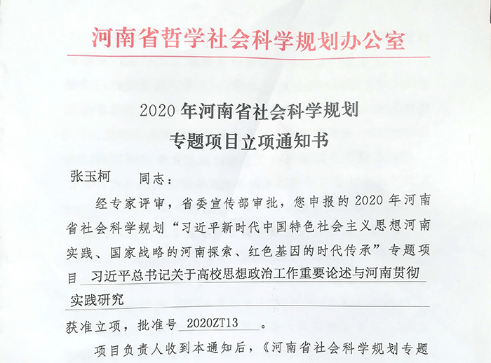 河南省社科规划项目是我省目前最高层次的社会科学研究项目,属于立项难度较大的省部级项目之一。张玉柯老师申报的《习近平总书记关于高校思想政治工作重要论述与河南贯彻实践研究》,把习近平总书记关于高校思想政治工作重要论述置于中原崛起、河南振兴战略背景下进行研究,对进一步推动高校服务地方经济建设发展具有重要意义。