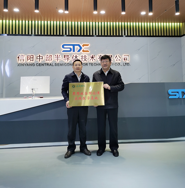 10月23日上午,信阳学院思政课实践教学基地挂牌仪式在信阳中部半导体技术有限公司举行。校党委书记郑先明,信阳中部半导体技术有限公司董事长张诺寒、总监吴宪军,我校有关单位负责人李肖利、胡志国、陈华林等参加了本次活动。