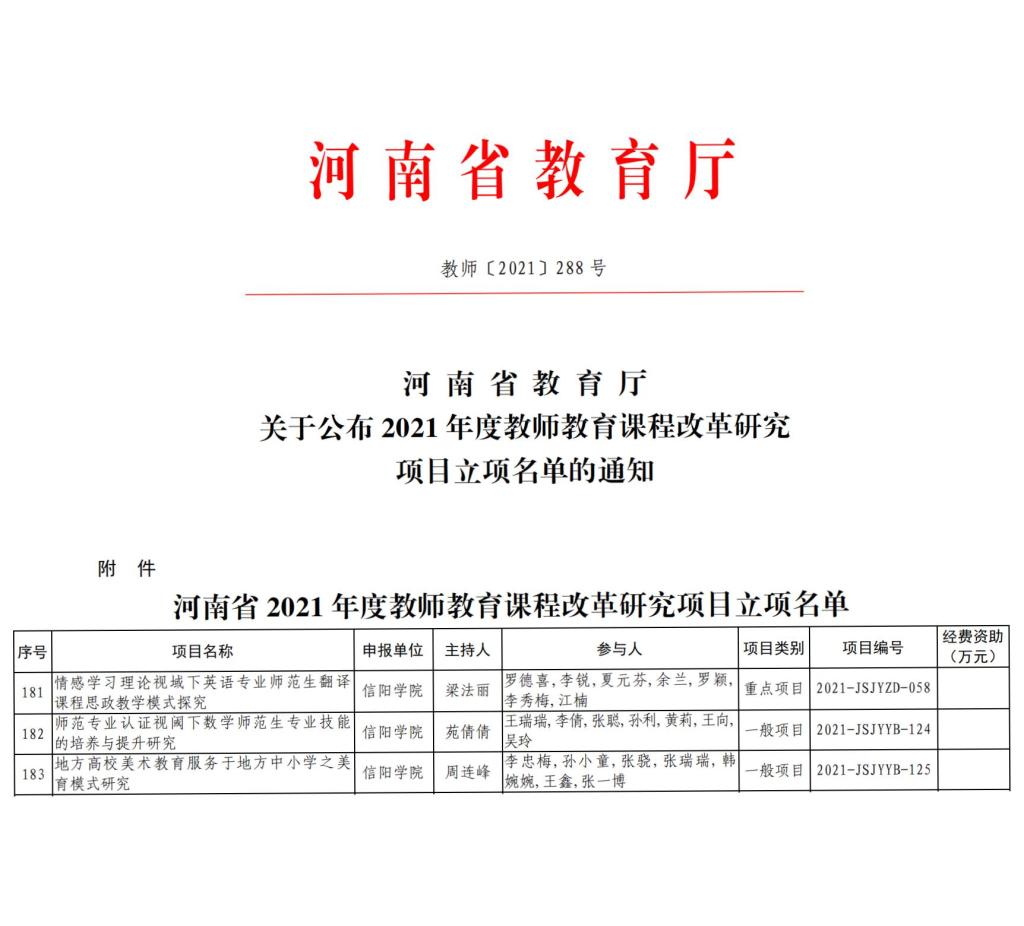 其中,外国语学院梁法丽主持申报的《情感学习理论视域下英语专业师范生翻译课程思政教学模式探究》项目获批重点项目;数学与统计学院苑倩倩主持申报的《师范专业认证视阈下数学师范生专业技能的培养与提升研究》和美术与设计学院周连峰主持申报的《地方高校美术教育服务于地方中小学之美育模式研究》等2个项目获批一般项目。