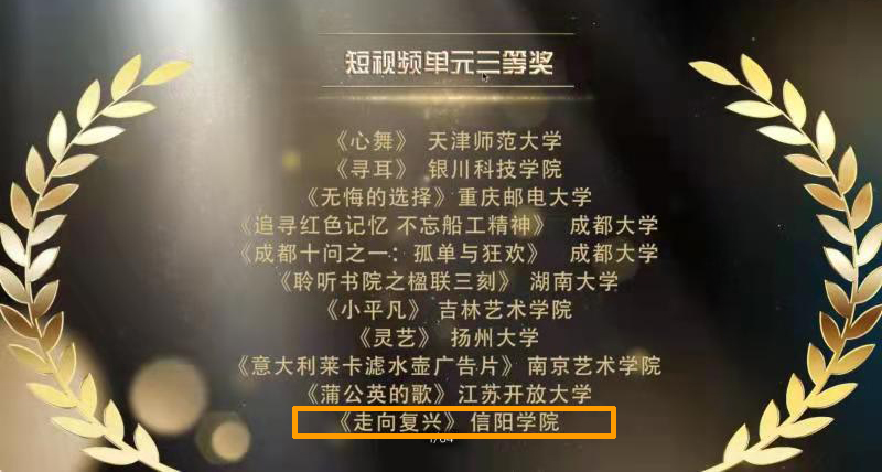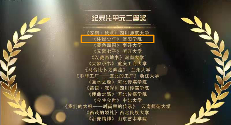 2020-2021年度中国高等院校影视学院“学院奖”共收到参赛作品2229份,入围作品134部。河南省本年度获奖作品5项,包含河南大学2项、信阳学院2项、信阳师范学院1项,其中《体操少年》为本年度我省所获最高奖。
