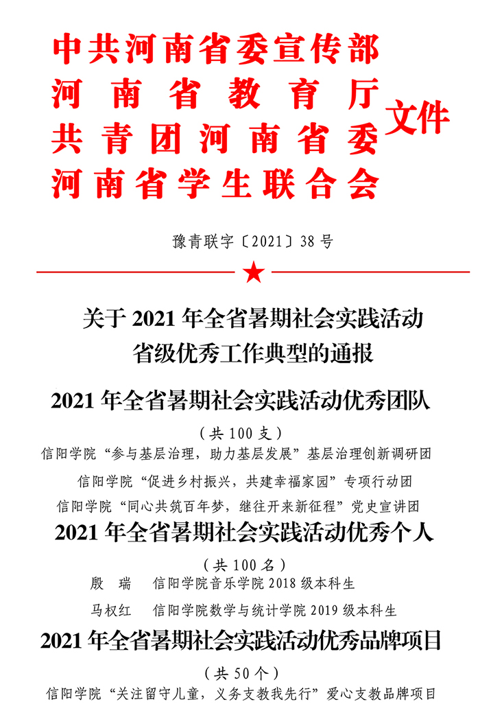 同时,在河南省委宣传部、河南省教育厅、共青团河南省委、河南省学生联合会联合下发的《关于2021年全省暑期社会实践活动省级优秀工作典型的通报》,我校“同心共筑百年梦,继往开来新征程”党史宣讲团、“参与基层治理,助力基层发展”基层治理创新调研团、“促进乡村振兴、共建幸福家园”专项行动团被评为2021年全省暑期社会实践活动优秀团队;“关注留守儿童,义务支教我先行”爱心支教品牌项目被评为2021年全省暑期社会实践活动优秀品牌项目;音乐学院2018级学生殷瑞和数学与统计学院2019级学生马权红被评为2021年全省暑期社会实践活动优秀个人。