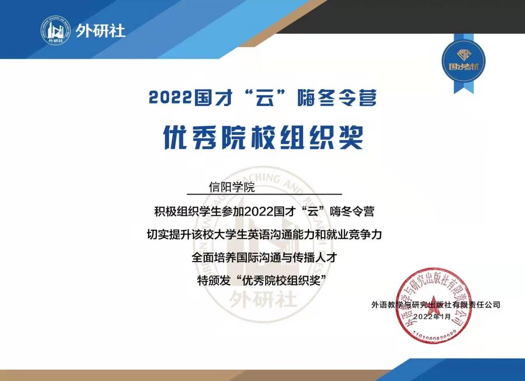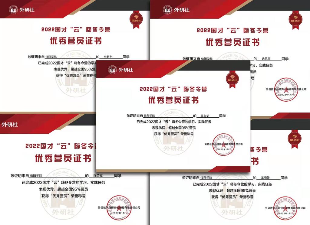 近日,由外研社主办、国才考试特别举办2022国才冬令营圆满收官。信阳学院外国语学院师生喜获佳绩,荣获冬令营优秀营员5名,优秀实习生1名,优秀指导教师1名。同时,学校荣获全国“优秀院校组织奖”。