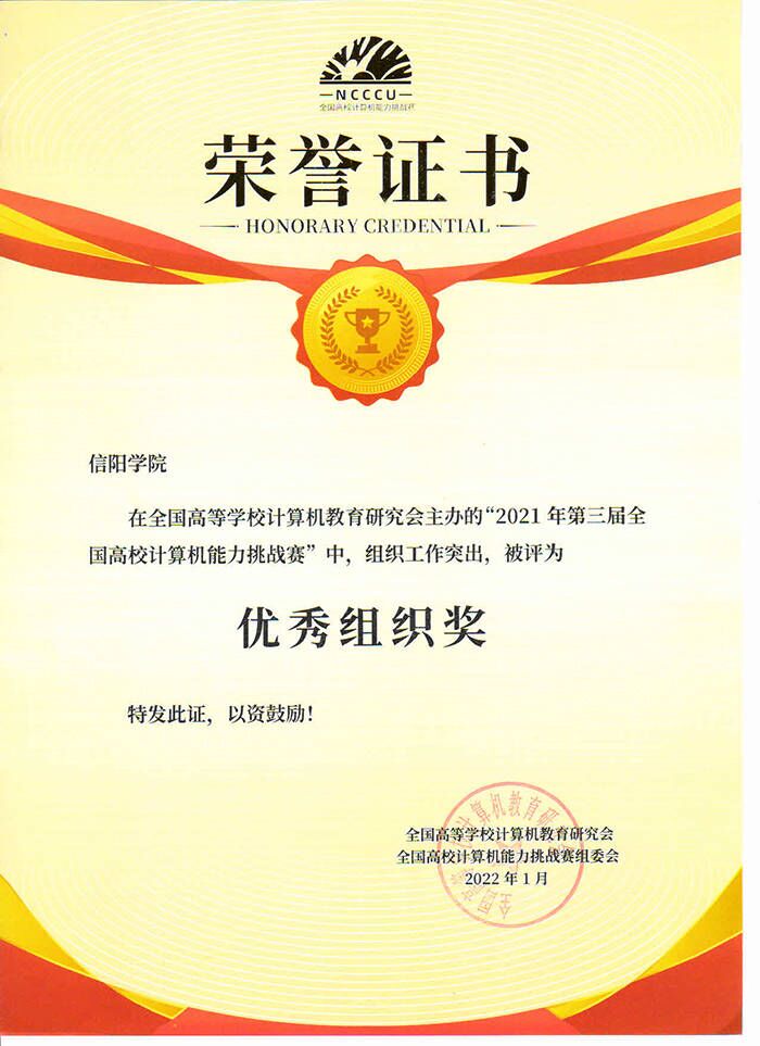近日,第三届全国高校计算机能力挑战赛成绩揭晓。我校大数据与人工智能学院参赛学子经过区域赛、国赛两轮激烈角逐,连创佳绩。其中在华中赛区区域赛中,获得二等奖3项,三等奖20项,优秀奖14项;在国赛决赛中,获得二等奖4项,三等奖11项,教师金广坤等9名教师被评为优秀指导老师,张滔等3名学生被评为优秀志愿者,信阳学院获优秀组织奖。
