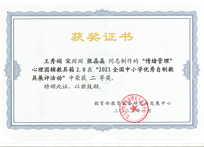 展评活动分为省赛、省内遴选、国赛三个环节。此前《情绪管理心理团辅教具箱1.0》在第十七届河南省中小学优秀自制教具暨学生科技创新小制作小发明展评活动中已获省级一等奖。经过三年不断的研发和升级,完成了1.0教具箱到2.0版本的迭代,在省内遴选会中,从三届省赛数十件一等奖作品中脱颖而出,成功入围国赛,并在全国的595件作品中获二等奖。我校客座教授、信阳市十三小校长王秀娟荣获全国中小学优秀自制教具展评活动自制教具能手称号。