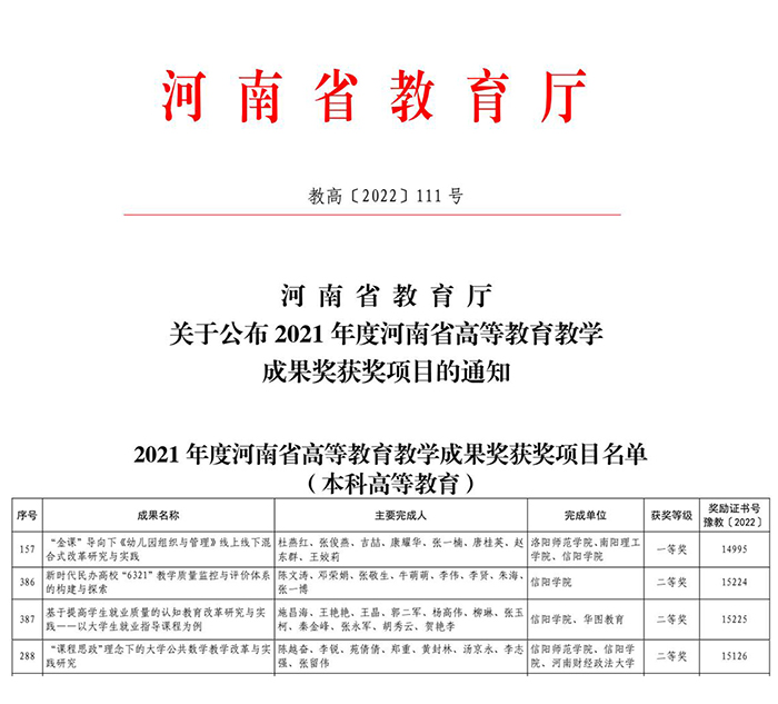 近日,河南省教育厅下发《关于公布2021年度河南省高等教育教学成果奖获奖项目的通知》(教高〔2022〕111号),我校4项教学成果喜获河南省高等教育教学成果奖。