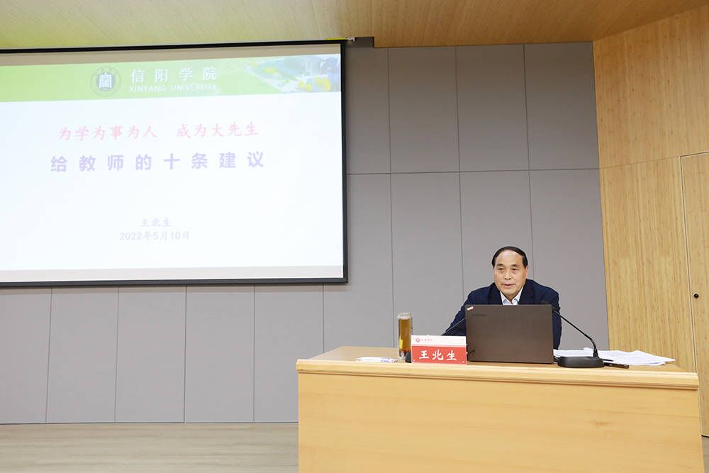 最后,王北生语重心长地向全体教师提出10条建议。一要尊重自己所选择的职业,热爱自己所从事的专业。二要教书育人,树立良好师德形象,无愧于人民教师的称号。三要始终牢记教育是良心活,不忘教育初心。四要“严格管理、悉心指导”,时刻考虑如何成就学生的未来。五要欲当先生,先当学生,不断吸取新知识新信息,充实提高自己。六要发扬榜样示范作用,记得学生无时不在的评价与模仿。七要遵守学术道德,做一个学术上清清白白的人。八要秉持终身学习理念,以先进教育理念与思想影响学生。九要强化教学质量,重视科学研究,教学科研相辅相成。十要校荣我荣、荣辱与共,与学校同荣辱共患难。勉励教师坚守教书育人初心,立德修身、潜心治学,不断完善自己、提高自己,争做学生为学、为事、为人的“大先生”,为培养德智体美劳全面发展的社会主义建设者和接班人、全面建设社会主义现代化国家不断作出新贡献。